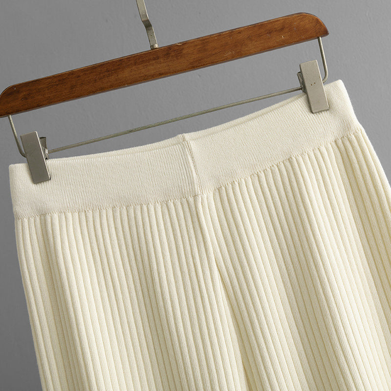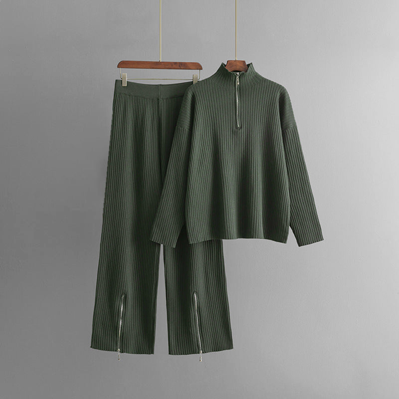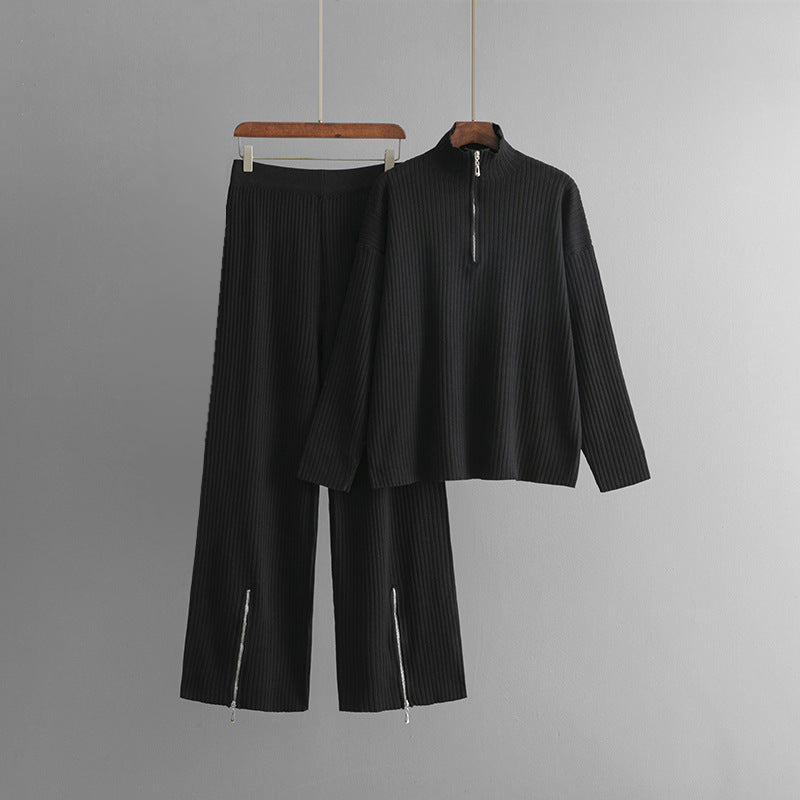 The Knit Harmony Set by Valentina Rossi features a high-collar sweater and wide-leg pants that effortlessly complement each other. Crafted from luxurious knit fabric, the set combines sophisticated elegance with relaxed comfort.