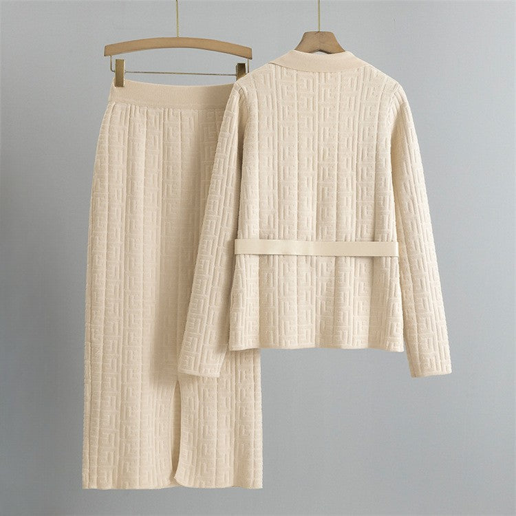 • The set includes: A tailored blazer with statement lapels and a coordinating skirt