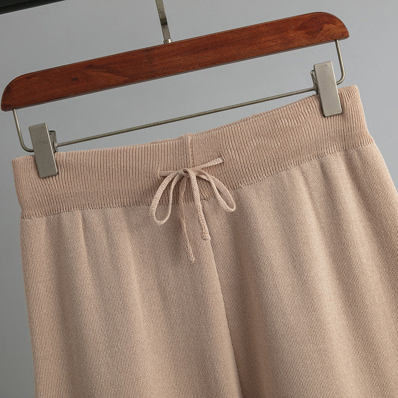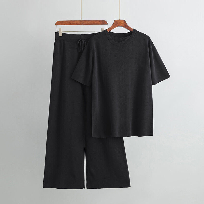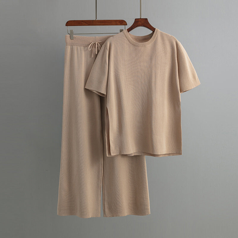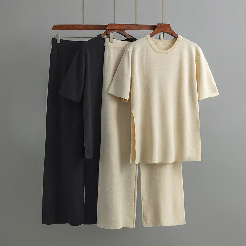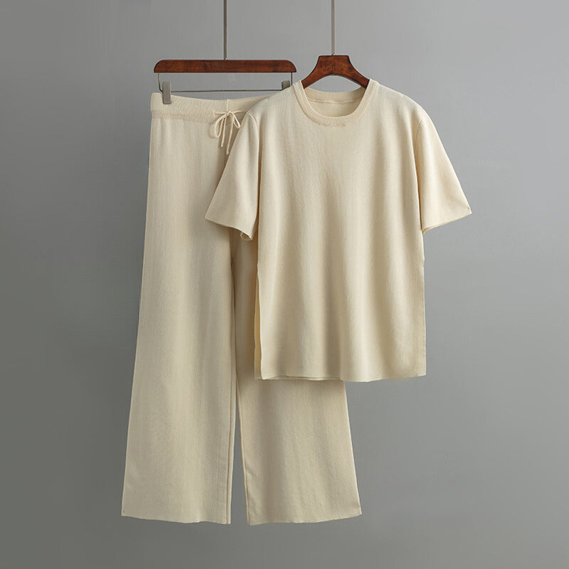 Embrace effortless elegance with the Sophie Laurent Daydream Duo Set. This two-piece ensemble features a relaxed knit T-shirt that drapes beautifully, paired with high-waisted lace-up trousers that effortlessly enhance your figure.